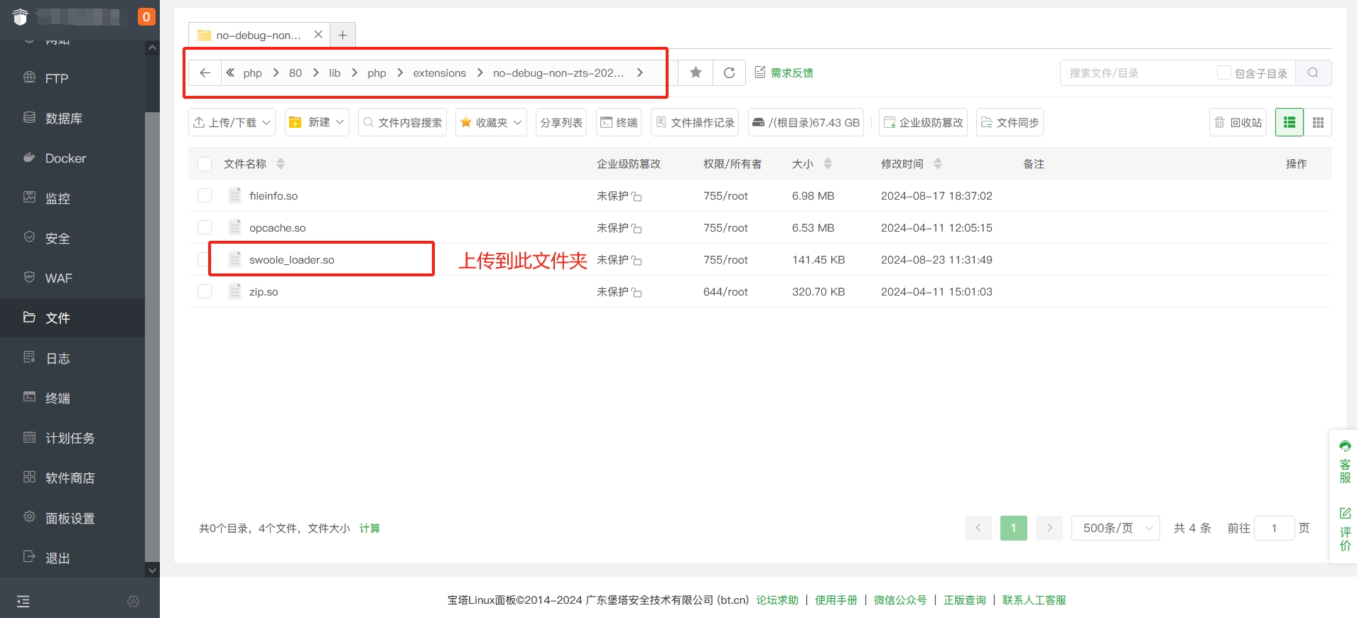 将刚才下载的Swoole Loader扩展文件(swoole_loader.dll或swoole_loader.so)上传到当前PHP的扩展安装目录中: