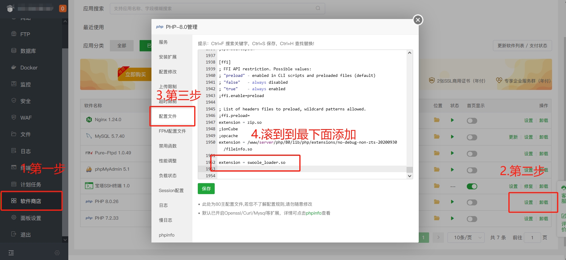 extension=swoole_loader.so注意:需要名称和刚才上传到当前PHP的扩展安装目录中的文件名一致