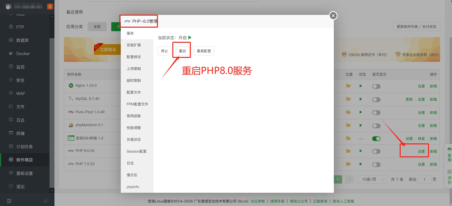 编辑此PHP配置文件:/www/server/php/80/etc/php.ini,在此文件底部结尾处加入如下配置